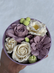 Коробка діаметр 12см. висота 6см. Приблизна вага 150 грамКвіти у наборі мікс. Ручна робота. Точне повторення композиції неможливе!